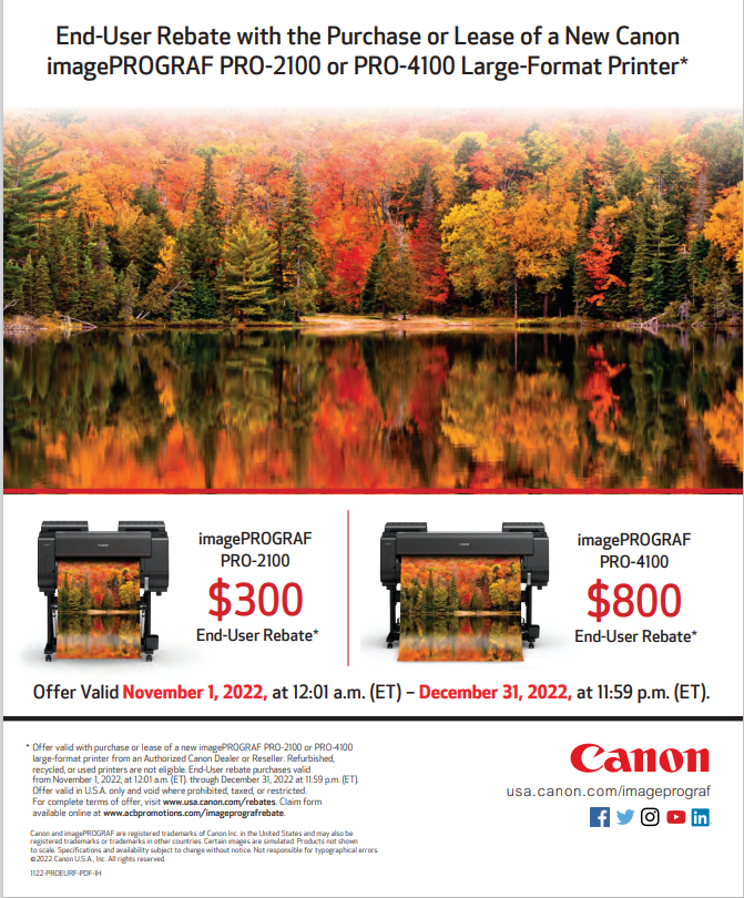 1. The rebate offer is redeemable only by end-user on purchasing or leasing a new imagePROGRAF PRO-4100 or PRO-2100 large-format printer from a Canon authorized dealer or reseller. Purchase or Lease must be made between November 1, 2022, 12:01AM ET and December 31, 2022, 11:59PM ET. Limit of one (1) rebate per eligible printer. Cash value of 1/100 of one cent. The rebate amounts are as follows: imagePROGRAF Large-Format Printer Eligible Models Rebate Amount PRO-4100 $800 PRO-2100 $300