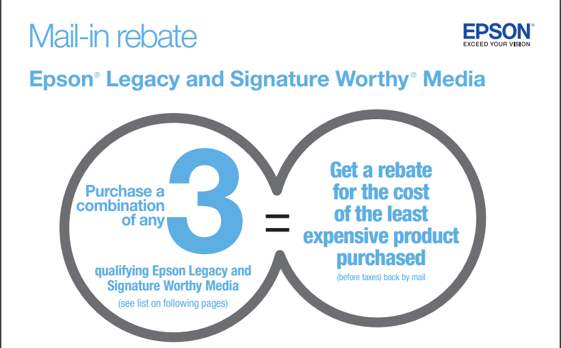 FOR PRODUCTS PURCHASED ON THE SAME INVOICE BETWEEN 1/1/2021 AND 1/31/2021 FROM IMAGE PRO AN EPSON AUTHORIZED PROFESSIONAL IMAGING RESELLER. EPSON WILL SEND YOU A CHECK FOR THE FULL PRICE (BEFORE TAXES) OF THE LEAST EXPENSIVE PRODUCT PURCHASED. CLAIMS MUST BE POSTMARKED WITHIN 30 DAYS FROM THE PURCHASE DATE.