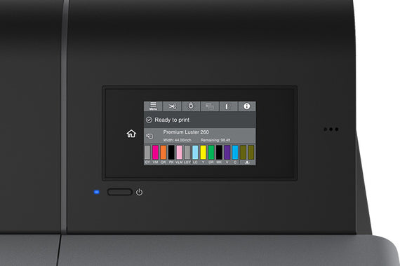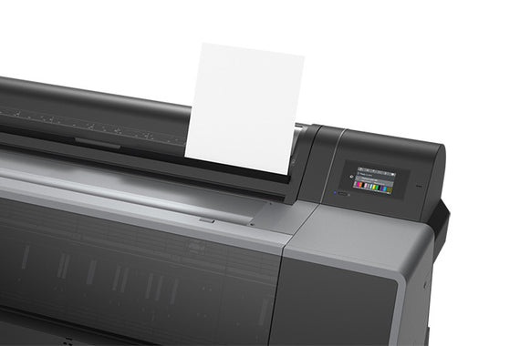 The unit features top-loading roll media support up to 24" wide and supports most photographic, fine art, and design media types up to 7" in diameter. Spindle-free media adapters are adjustable for both 2" and 3" core media and a built-in automatic rotary media cutter smoothly cuts most photographic and fine art media types. A front feeder for poster board media up to 1.5mm thick is also provided, and the unit supports single sheets up to 24" wide. For easy navigation, the printer comes with a customizable 4.3" color touchscreen, and the P7570 also offers easy workflow integration and is compatible with most third-party RIP workflow software.